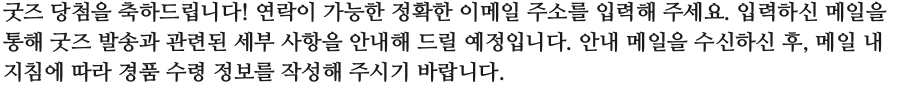 당첨된 경우, 입력하신 메일을 통해 굿즈 발송과 관련된 세부 사항을 안내해 드릴 예정입니다. 정보 확인 후 이벤트 종료 후 영업일 180일 내 순차적으로 발송됩니다.