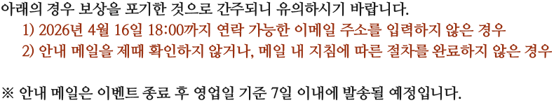 3.주소 정보 수집용 메일을 받은 후 배송지 정보를 정확히 확인하여 보내 주시기 바랍니다. 배송지 미제출, 정보 오류, 누락 등 개인적인 사유로 인해 경품 발송이 실패하거나 반송될 경우