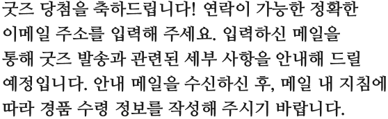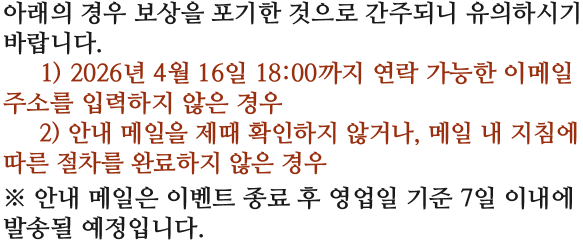 3. 주소 정보 수집용 메일을 받은 후 배송지 정보를 정확히 확인하여 보내 주시기 바랍니다. 배송지 미제출, 정보 오류, 누락 등 개인적인 사유로 인해 경품 발송이 실패하거나 반송될 경우